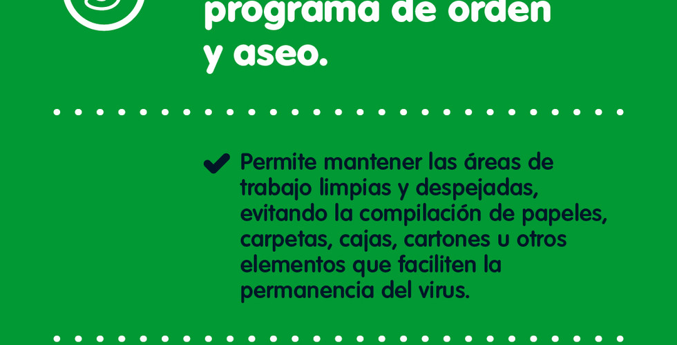 Implementar el programa de orden y aseo, el cual permite mantener las áreas de trabajo limpias y despejadas, evitando la compilación de papeles, carpetas, cajas, cartones u otros elementos que faciliten la permanencia del virus.